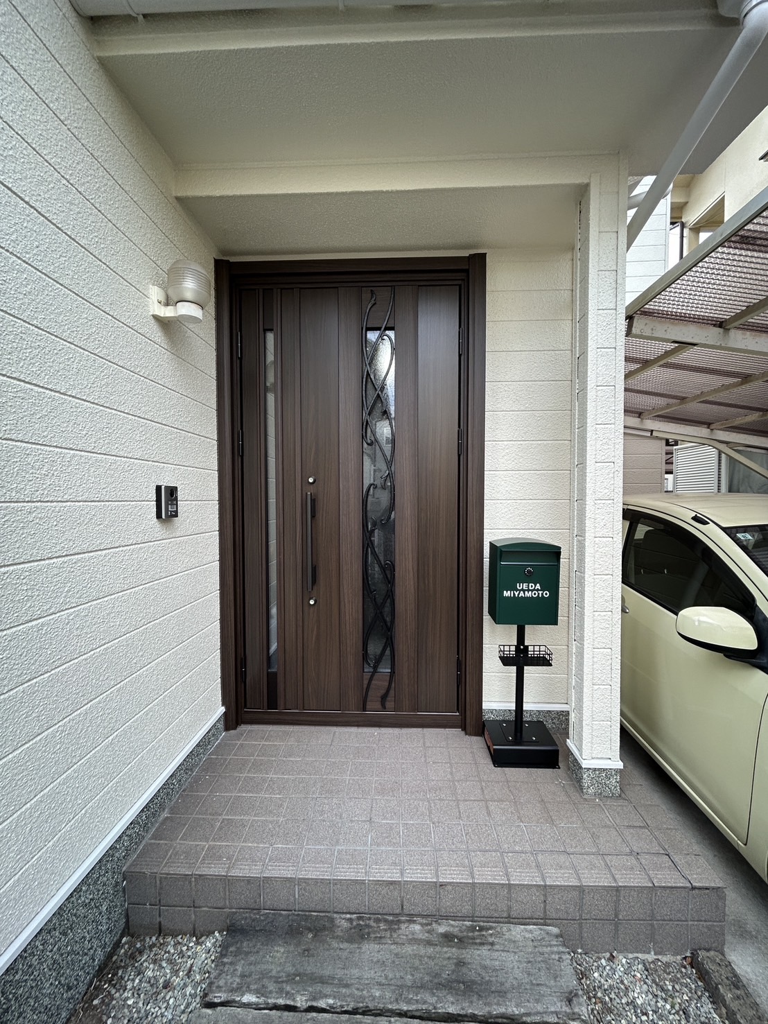 今回は外壁塗装の色味に合わせて、重厚感のあるデザインかつ最新の防犯機能を備えたドアをご提案させていただきました。